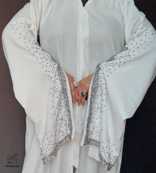 Nouria (White) - Open Abaya with Hand Crafted Glass Beadwork - White